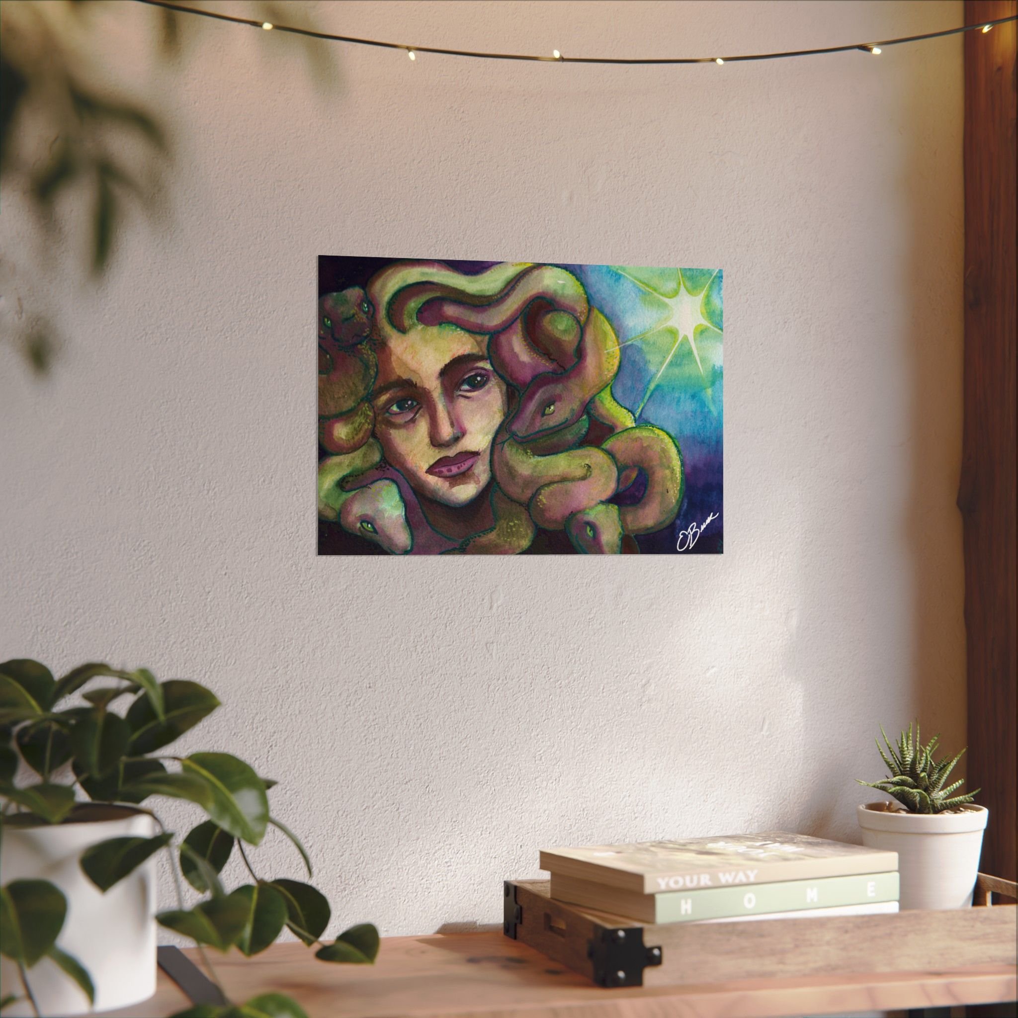 This textured watercolor matte poster brings a mythic hush to any room. Thick, tactile paper and archival inks capture the soft washes and layered hues of the original painting — the figure’s thoughtful gaze and the sinuous, living curves around her feel almost movable beneath your fingers. The matte, textured surface reduces glare and adds depth, making every subtle color shift and brush stroke read like original watercolor on paper. Hang it above a reading nook, lean it on a mantel, or layer it into a gallery wall to anchor a space with quiet, story-driven art that invites slow looking and conversation.